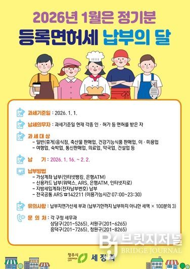 브릿지저널 김경미 기자 | 청주시는 2026년 1월 정기분 등록면허세(면허) 12만1천337건에 대해 총 32억원을 부과했다고 18일 밝혔다. 이는 전년 대비 3천352건, 1억원이 증가한 규모다.
