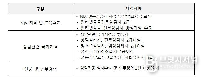 선발 자격은 ▲한국지능정보사회진흥원 시행 인터넷 중독 전문상담사 2급 자격증 소지자 ▲인터넷중독 전문인력 양성교육 이수자 등 관련 자격을 갖춘 인력이다.