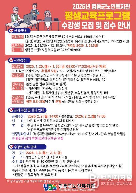 영동은 신청 인원이 모집 정원을 초과할 경우 추첨제로 수강생을 선발하며, 공개 추첨은 2월 2일 오후 2시, 유튜브 ‘영동군노인복지관’ 채널을 통해 실시간으로 중계될 예정이다.