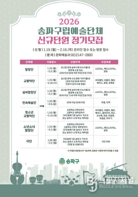 브릿지저널 김경미 기자 | 서울 송파구는 지역 문화예술 저변 확대와 구민의 문화 향유 기회 제공을 위해 오는 2월 19일까지 구립문화예술단체 신규단원을 공개 모집한다고 밝혔다.