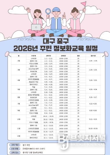 브릿지저널 김진석 기자 | 대구 중구는 주민의 디지털 활용 역량을 높이고 정보 격차를 해소하기 위해 오는 2월부터 구청 12층 정보화교육장에서 ‘주민 정보화교육’을 본격 운영한다.