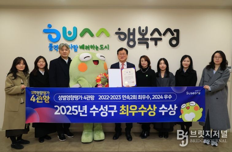 브릿지저널 김진석 기자 | 대구 수성구는 대구광역시가 9개 구·군을 대상으로 실시한 ‘2025년 성별영향평가 구·군 수행평가’에서 최우수상을 수상했다고 밝혔다. 이로써 수성구는 2022·2023년 최우수상, 2024년 우수상에 이어 4년 연속 우수기관으로 선정되는 성과를 거뒀다.