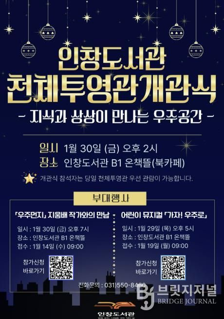 브릿지저널 김경미 기자 | 구리시는 오는 1월 30일 오후 2시 인창도서관 지하 북카페에서 주요 내빈이 참석한 가운데 4층 야외에 조성된 인창도서관 천체투영관 개관식을 개최한다고 밝혔다.