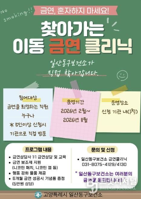 브릿지저널 김경미 기자 | 고양특례시 일산동구보건소는 보건소 방문이 어려운 직장인 흡연자를 대상으로 ‘찾아가는 금연클리닉’을 운영한다고 19일 밝혔다.