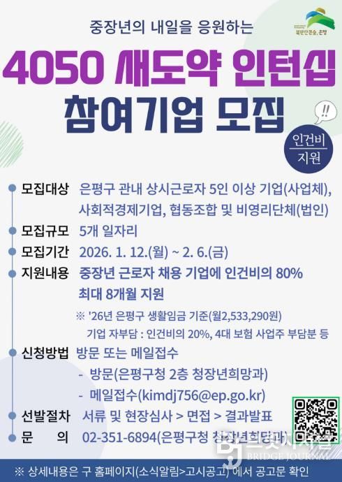브릿지저널 김경미 기자 | 서울 은평구는 직업 전환이 필요한 중장년 세대에게 양질의 일자리를 제공하기 위해 ‘4050 새도약 인턴십 프로그램’에 참여할 기업을 모집한다고 밝혔다.