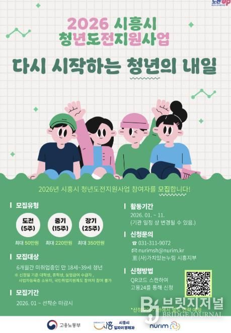브릿지저널 김경미 기자 | 시흥시는 취업과 사회 진출에 어려움을 겪고 있는 청년들의 재도전을 지원하기 위해 ‘2026년 청년도전지원사업’ 참여자 156명을 모집한다.
