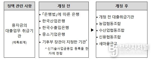 이번 개정안은 재생에너지 정책융자 취급기관(현재 15개 기관)에 지역과 밀접한 4개 금융기관 추가를 주요 내용으로 하고 있다.