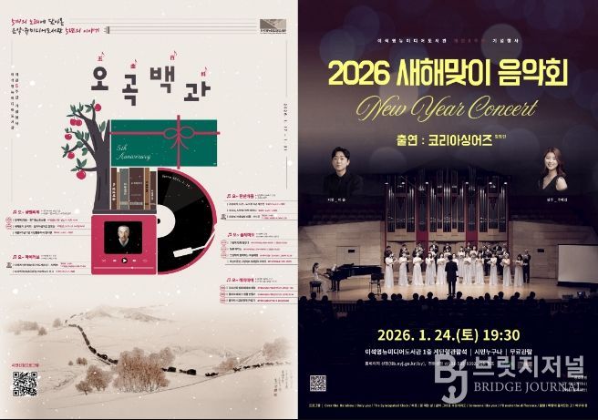 대표 프로그램으로는 오는 24일 오후 7시 30분, 도서관 1층 계단형 관람석에서 열리는 ‘2026 새해맞이 음악회’가 있다. 음악회에는 코리아싱어즈 합창단, 오카리나 연주자 김욱, 클라리네티스트 김예원 등이 출연해 새해의 희망을 전하는 공연을 선보인다.