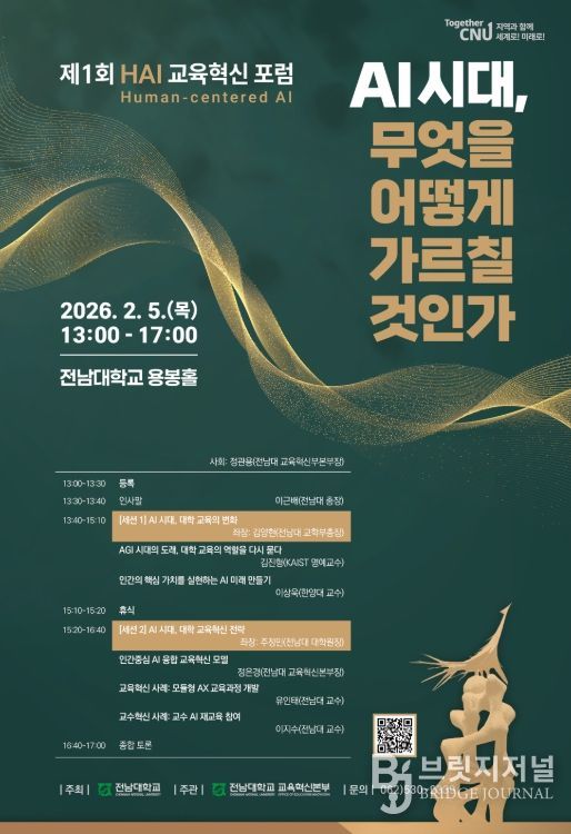 브릿지저널 김경미 기자 | 전남대학교가 오는 2월 5일 오후 1시 전남대 국제회의동 용봉홀에서 ‘제1회 HAI(Human-centered AI) 교육혁신 포럼’을 개최하고, AI 시대에 대응하는 대학 교육의 새로운 이정표를 제시한다.