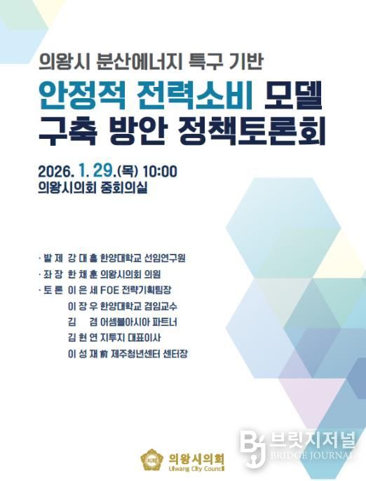 브릿지저널 김경미 기자 | 의왕시의회는 오는 29일 오전 10시, 시의회 중회의실에서 '의왕 분산에너지 특구 기반 안정적 전력소비 모델 구축 방안 정책토론회'를 개최한다고 밝혔다.