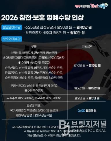 특히 2026년부터는 공상공무원, 국가사회발전 특별공로상이자 및 공로자, 재해부상군경, 재해부상공무원에게도 보훈명예수당을 신설해 월 2만 원을 지급할 예정이다.