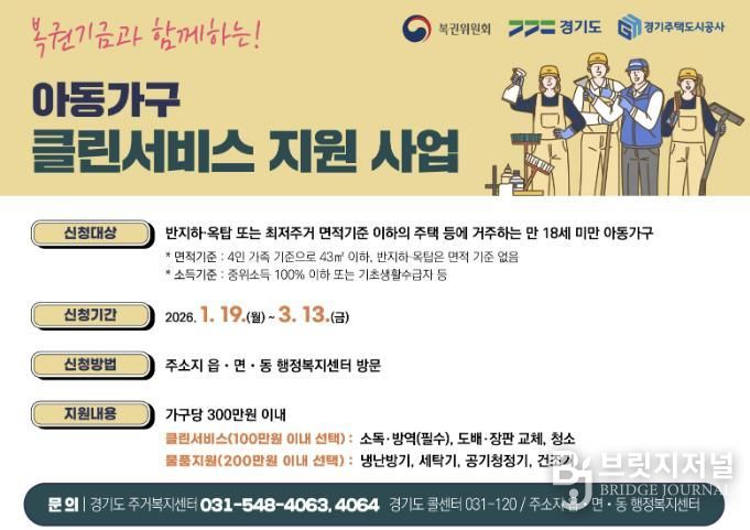 브릿지저널 김경미 기자 | 의왕시가 복권기금과 함께하는 경기도 ‘아동가구 클린서비스 지원사업’의 신청을 1월 19일부터 3월 13일까지 받는다.