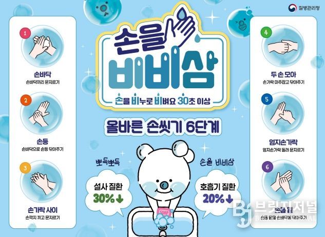 올바른 손 씻기는 감염병 예방을 위한 가장 쉽고 효과적인 방법으로, 흐르는 물에 비누로 30초 이상 손을 씻으면 최근 유행 중인 인플루엔자와 노로바이러스 등 장관감염증과 호흡기 감염병 예방에 큰 효과가 있다.