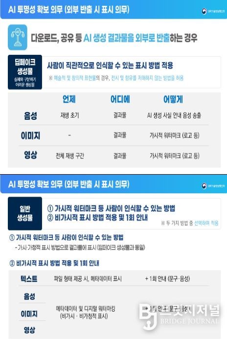 브릿지저널 김경미 기자 | 과학기술정보통신부는 1월 22일'인공지능 발전과 신뢰 기반 조성 등에 관한 기본법' ‘인공지능 기본법’)상 투명성 확보 의무(제31조)의 구체적인 이행 방안을 담은'인공지능 투명성 확보 안내 지침(가이드라인)'을 공개했다.