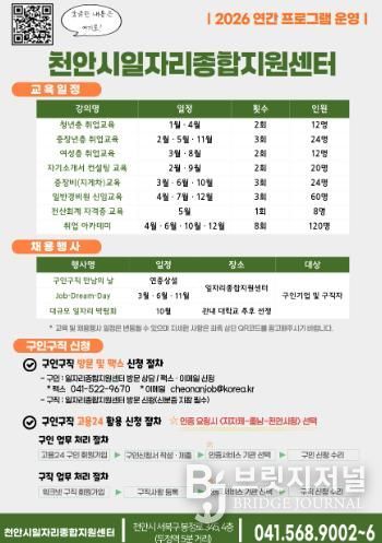 천안시는 취업 경쟁력 강화와 실질적인 채용 연계를 위해 ‘2026년 천안시 일자리종합지원센터 운영 계획’을 확정하고 본격적으로 추진한다고 22일 밝혔다.