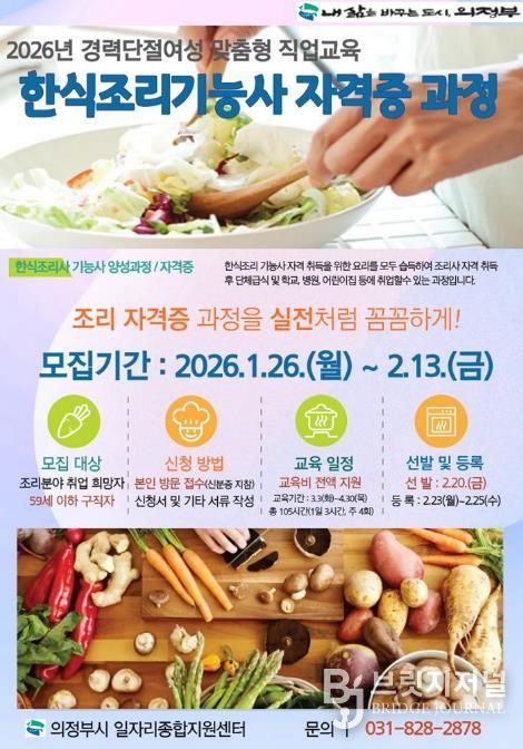 브릿지저널 김경미 기자 | 의정부시는 경력단절여성의 안정적인 재취업을 지원하기 위해 ‘2026년 한식조리기능사 자격증 과정’ 참여자를 모집한다.