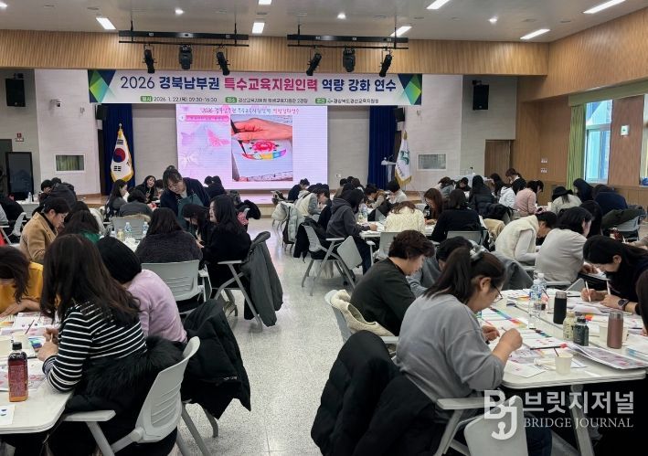 브릿지저널 정보영 기자 | 경산교육지원청 특수교육지원센터는 1월 22일 학생교육지원관 2강당에서 경북 남부권(경산, 영천, 청도, 경주) 유, 초, 중, 고등학교, 특수학교 특수교육실무사 및 사회복무요원 150여 명을 대상으로 역량 강화 연수를 실시했다.