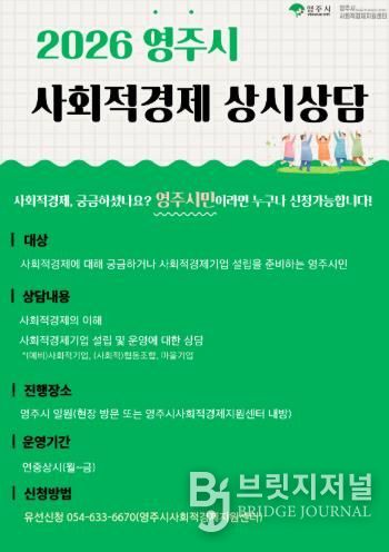 브릿지저널 정보영 기자 | 영주시와 영주시사회적경제지원센터는 사회적경제에 대한 시민들의 이해를 높이고 신규 사회적경제기업 발굴을 지원하기 위해 ‘2026 영주시 사회적경제 상시상담’을 연중 운영한다고 밝혔다.