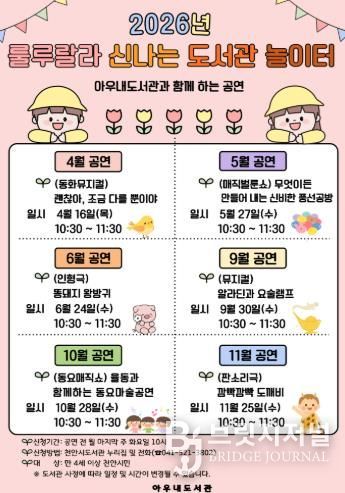 참여 신청은 공연 전월 마지막주 화요일 오전 10시부터 전화 등으로 가능하며, 자세한 사항은 천안시도서관 누리집에서 확인할 수 있다.