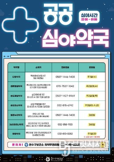 브릿지저널 김경미 기자 | 연수구는 심야시간대 주민의 의약품 접근성을 개선하고 지역 의료 안전망을 강화하기 위해 ‘공공심야약국’ 7곳을 운영한다.