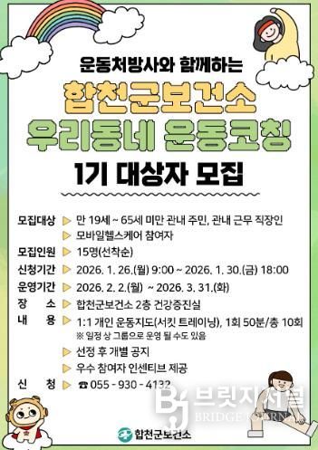 브릿지저널 김경미 기자 | 합천군은 개인별 체력과 건강 상태를 고려한 맞춤형 운동 프로그램 '우리 동네 운동코칭 : PT with U'에 참여할 1기 대상자를 모집한다고 23일 밝혔다.