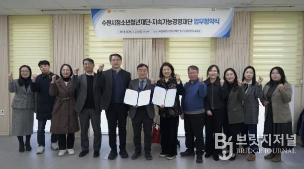 브릿지저널 김경미 기자 | 수원시청소년청년재단과 지속가능경영재단은 1월 22일 고립‧은둔 청소년‧청년 및 사회적 취약 청소년‧청년 지원을 위한 업무협약(MOU)을 체결했다.