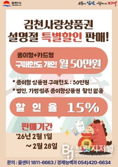 브릿지저널 정보영 기자 | 김천시는 오는 설 명절을 앞두고 2월 한달간 김천사랑상품권을 15% 특별 할인 판매하여 지역 소비 활성화에 나선다.