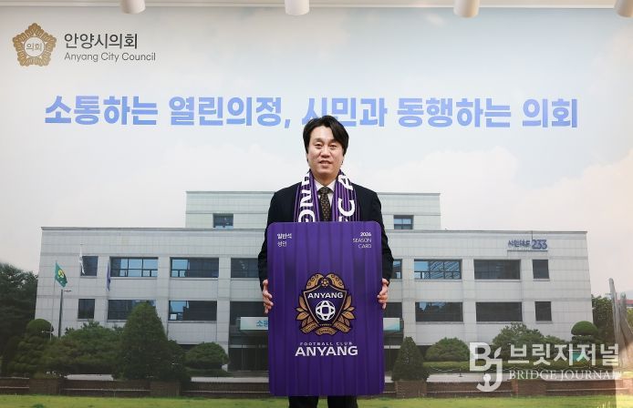 브릿지저널 김경미 기자 | 안양시의회 박준모 의장이 1월 23일 시의회 의장실에서 2026시즌 FC안양 연간회원권을 구매했다.