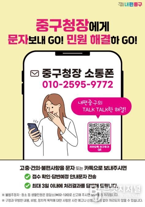브릿지저널 김경미 기자 | 서울 중구가 2022년 10월부터 운영 중인 '구청장 소통폰'으로 주민 일상을 더 꼼꼼하게 살핀다. 구는 올해부터 구청장 소통폰의 사후 안부 전달 시스템인 '민원처리 해피톡' 발송 주기를 기존 2개월에서 1개월로 단축했다.