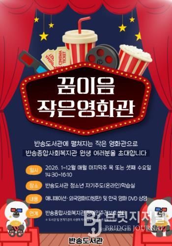 브릿지저널 윤나영 기자 | 부산광역시립반송도서관은 오는 12월까지 매달 마지막 주 목요일 또는 셋째 주 수요일에 반송종합사회복지관 장애인주간보호센터 원생을 대상으로 도서관 청소년자기주도학습실에서 ‘꿈이음작은영화관’을 운영한다.