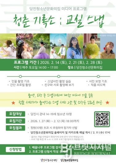 브릿지저널 정보영 기자 | (재)당진시청소년재단 당진청소년문화의집(관장 유수민)은 오는 2월 14일부터 28일까지 매주 토요일, 14시부터 17시까지 관내 14~19세 청소년을 대상으로 미디어 프로그램 [청춘 기록소 : 교실 스냅]을 운영할 예정이다.