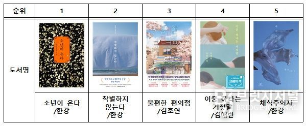 『작별하지 않는다』, 『채식주의자』 등 한강 작가의 작품이 다수 상위권에 오르며 꾸준한 독서 흐름을 보였다.