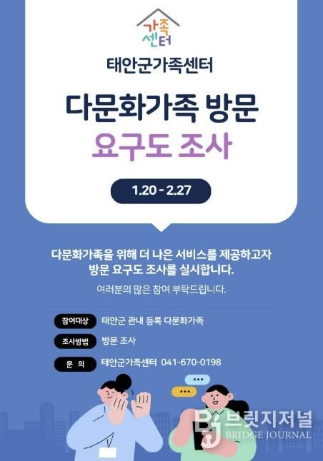 브릿지저널 정보영 기자 | 태안군이 다문화가족의 급변하는 생활 실태를 정확히 파악하고 위기 요인이 있는 가구를 선제적으로 발굴하기 위해 ‘2026년 다문화가족 요구도 방문 전수조사’를 전격 실시한다.