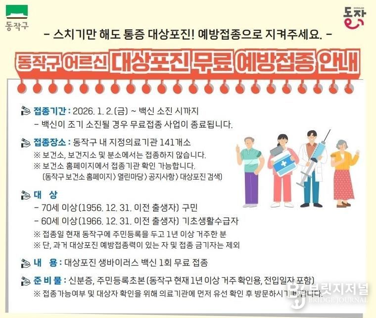 브릿지저널 김경미 기자 | 동작구는 감염성 질환에 취약한 어르신들의 면역강화와 건강 증진을 위해 ‘대상포진 무료 예방접종’을 실시한다고 밝혔다.