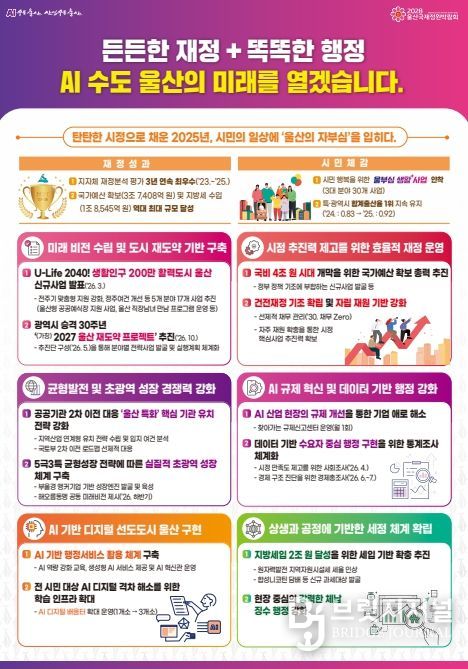 브릿지저널 윤나영 기자 | 울산시는 2026년 한 해 동안 건전한 재정 운영을 바탕으로 미래 이상(비전) 실현과 도시 재도약을 위한 주요 시정 과제를 본격 추진한다고 밝혔다.
