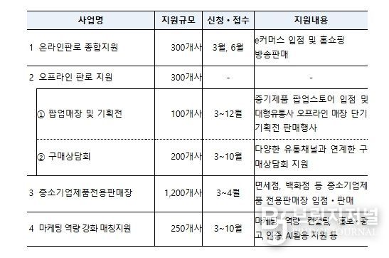 이번 사업의 총 지원 규모는 141억 7천만 원이며, 주요 지원 프로그램은 ①온라인 판로지원, ②오프라인 판로지원, ③중소기업제품 전용판매장 운영, ④마케팅 역량강화 프로그램 등이다.