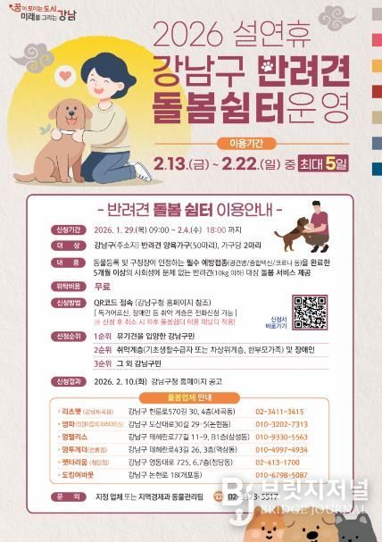 브릿지저널 김경미 기자 | 꿈이 모이는 도시, 미래를 그리는 강남구가 설 연휴 기간 안심하고 반려견을 맡길 수 있는 ‘반려견 돌봄 쉼터’를 운영한다. 접수는 1월 29일부터 2월 4일까지 진행하며, 선정된 반려견은 2월 13일부터 22일 사이 최대 5일간 무료로 돌봄 서비스를 이용할 수 있다.