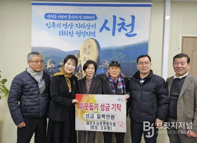브릿지저널 김경미 기자 | 산청군 시천면은 지난 26일 재진시천면향우회에서 ‘희망2026 나눔캠페인’에 동참, 이웃돕기성금 100만원을 전달했다고 28일 밝혔다.
