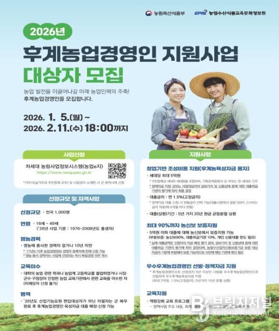브릿지저널 정보영 기자 | 제주시는 농촌 고령화를 해소하고, 미래 농업인력을 육성하기 위해 ‘2026년 후계농업경영인 지원사업’ 대상자를 2월 11일까지 모집한다.