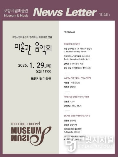 브릿지저널 정보영 기자 | 포항시립미술관은 오는 29일 제104회 미술관 음악회 ‘MUSEUM·MUSIC’를 개최한다.