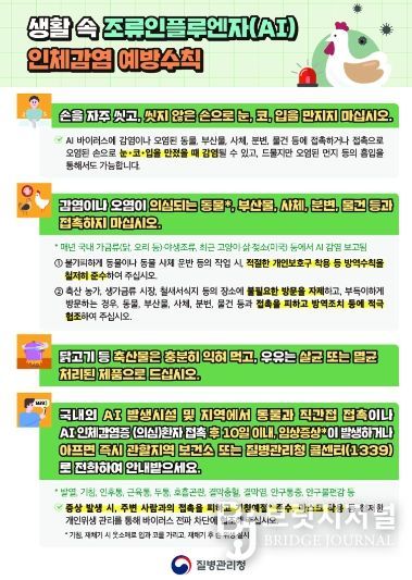 브릿지저널 김경미 기자 | 화순군은 28일 최근 인근 지역에서 조류인플루엔자(AI)가 발생함에 따라 지역사회 내 조류인플루엔자(AI) 인체감염증 예방을 위해 예방수칙 준수를 적극 당부했다고 밝혔다.