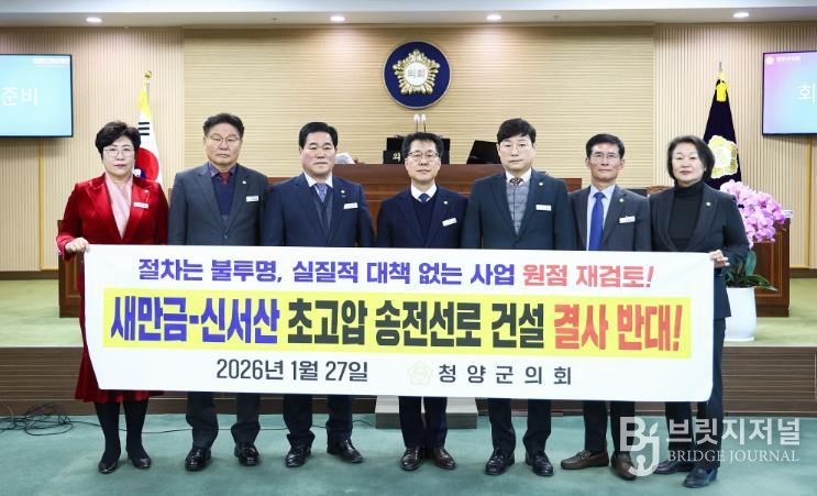 브릿지저널 정보영 기자 | 청양군의회는 군민의 생명과 안전을 위협하고 청정한 자연환경과 지역의 지속가능한 발전을 저해하는 새만금–신서산 초고압 송전선로 건설사업에 대해 단호히 반대하며 사업의 즉각 중단과 전면 재검토를 촉구하는 결의문을 채택했다.