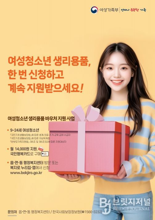 브릿지저널 정보영 기자 | 여성가족부와 계룡시는 경제적 부담으로 생리용품 구입에 어려움을 겪는 여성청소년의 건강권 보장과 복지 향상을 위해 ‘여성청소년 생리용품 바우처 지원사업’을 연중 운영하고 있다.