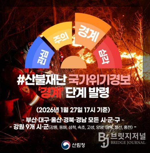 브릿지저널 윤나영 기자 | 최근 동해안과 영남 지역의 산불 위험이 커짐에 따라 2026년 1월 27일 오후 5시를 기해 부산, 대구, 울산, 경북, 경남 지역과 강원도의 9개 시군(강릉, 동해, 삼척, 속초, 고성, 양양, 태백, 정선, 홍천)의 산불재난 국가위기경보가 기존 ‘주의’ 단계에서 ‘경계’ 단계로 상향됐다.