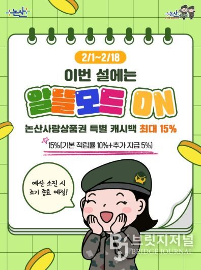 브릿지저널 정보영 기자 | 논산시가 설 명절을 맞아 지역 소비 활성화를 위해 ‘논산사랑상품권 특별 적립금(캐시백)’을 추진한다.