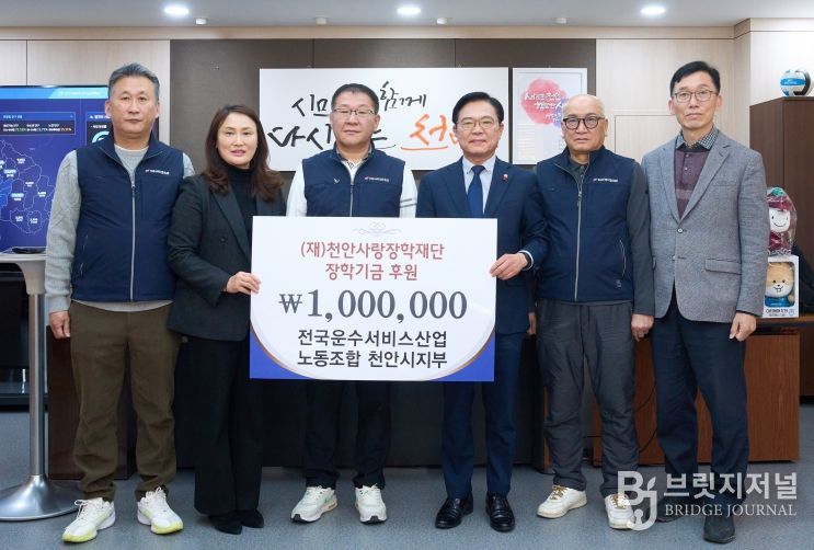 브릿지저널 정보영 기자 | 천안시는 30일 전국운수서비스산업노동조합 천안시지부가 미래 인재 양성을 위해 천안사랑장학재단에 2031년까지 매년 장학기금 100만 원을 기탁하기로 약속했다고 밝혔다.