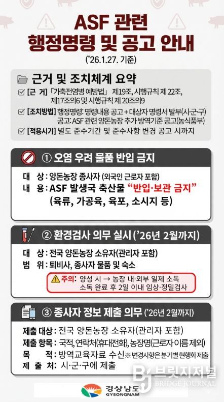 브릿지저널 김경미 기자 | 경상남도는 전남 영광 종돈장에서 아프리카돼지열병(ASF)이 발생하는 등 전국적으로 확산 우려가 커짐에 따라, 도내 모든 양돈농장과 축산시설을 대상으로 고강도 방역 대책을 추진한다고 밝혔다.