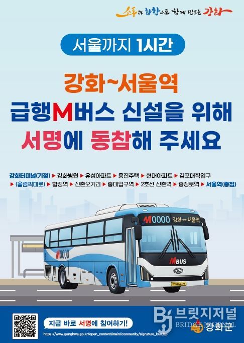 브릿지저널 김경미 기자 | 강화군은 ‘강화~서울역 M버스(광역급행버스)’ 노선 신설 유치를 위해 대규모 범군민 서명운동을 전개하며, 대대적인 행정력 집중에 나선다.