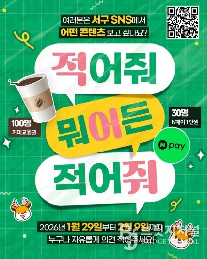 브릿지저널 김경미 기자 | 인천 서구는 주민과 더욱 효과적으로 소통하고 주민 눈높이에 맞는 콘텐츠를 제작하기 위해 ‘2026년 서구 유튜브·소셜미디어 콘텐츠 선호도 조사’를 오는 1월 29일부터 2월 9일까지 실시한다.