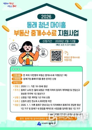 브릿지저널 윤나영 기자 | 부산 동래구는 청년의 주거 안정을 지원하고 청년 창업을 유도하기 위해 ‘2026년 동래 청년 마이홈 부동산 중개수수료 지원 사업’을 추진한다고 밝혔다. 접수 기간은 12월 10일까지이며, 예산 소진 시 조기 마감된다.